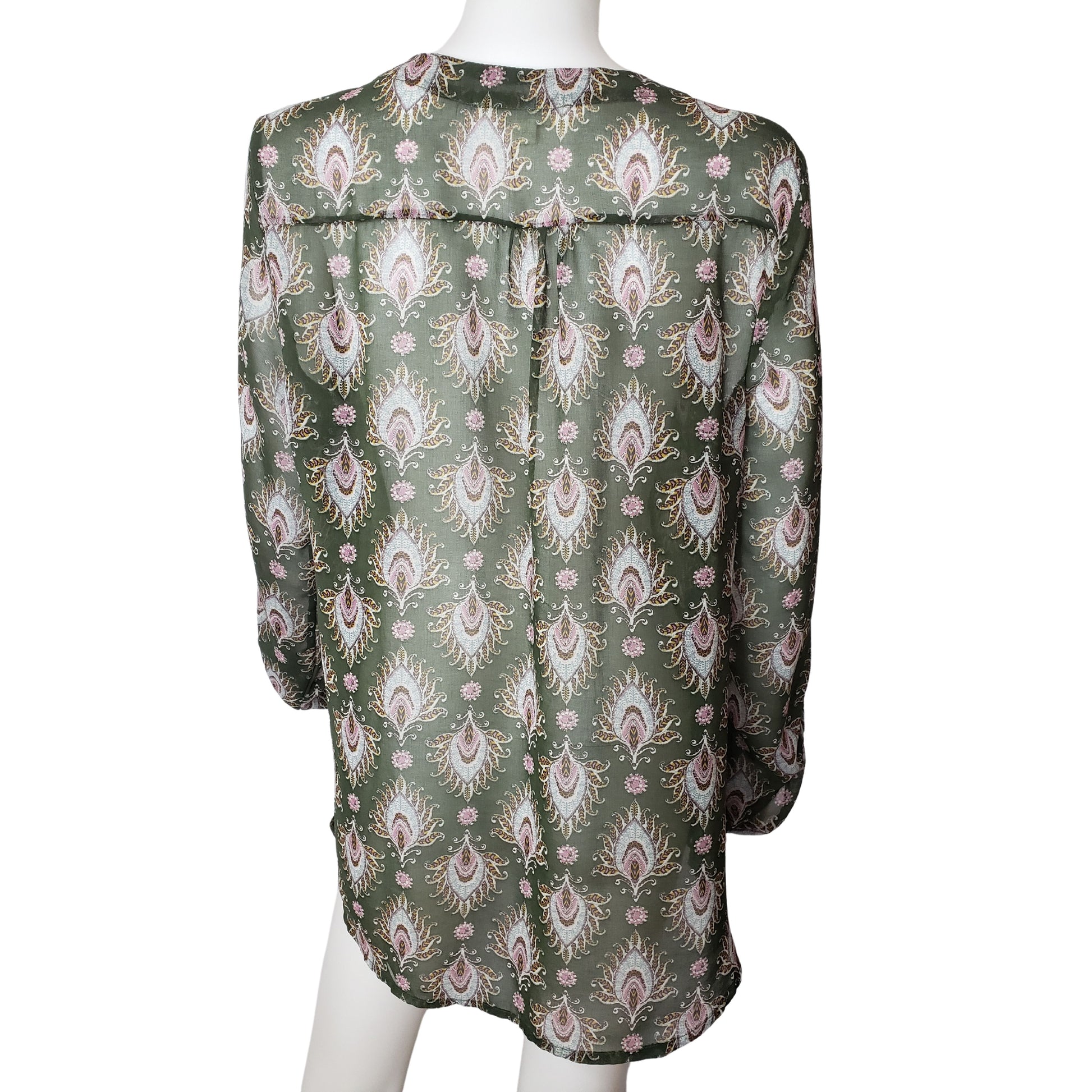 This gorgeous dark green shirt has lovely paisleys in tones of blue, pink and brown. With a V neck and loosely buttoned-up sleeves, this shirt has a loose and comfortable fit. It's sheer so a camisole underneath is recommended.