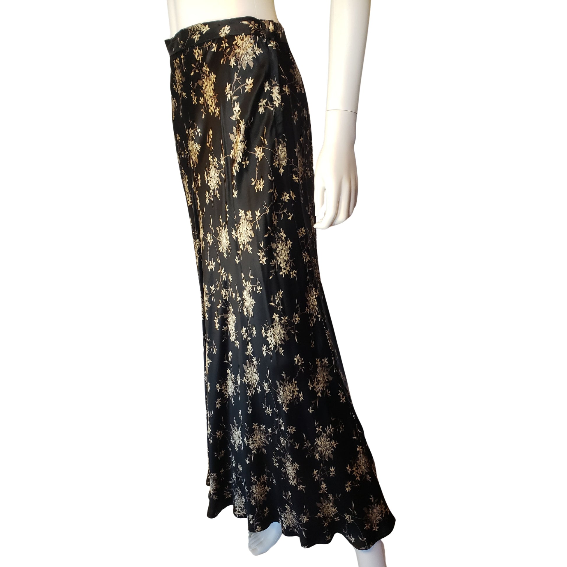 Stunning A-line skirt made with sleek rayon material and accented with bouquets of flowers in beige tones. The skirt zips and buttons on left side of waist and hip.