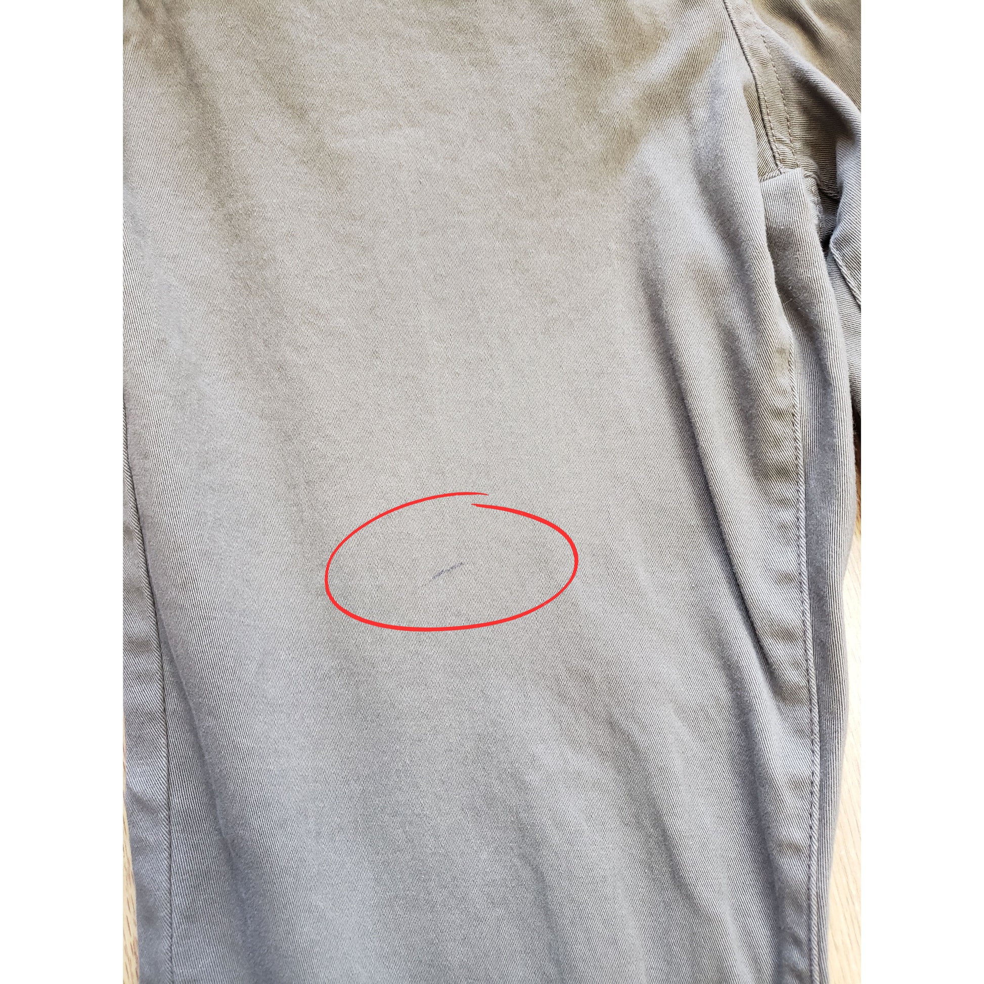 Casual sandstone colored pants with 2 front and 2 back pockets. Very soft and comfortable. There is a small stain that looks like a pen mark on the right thigh (see picture).