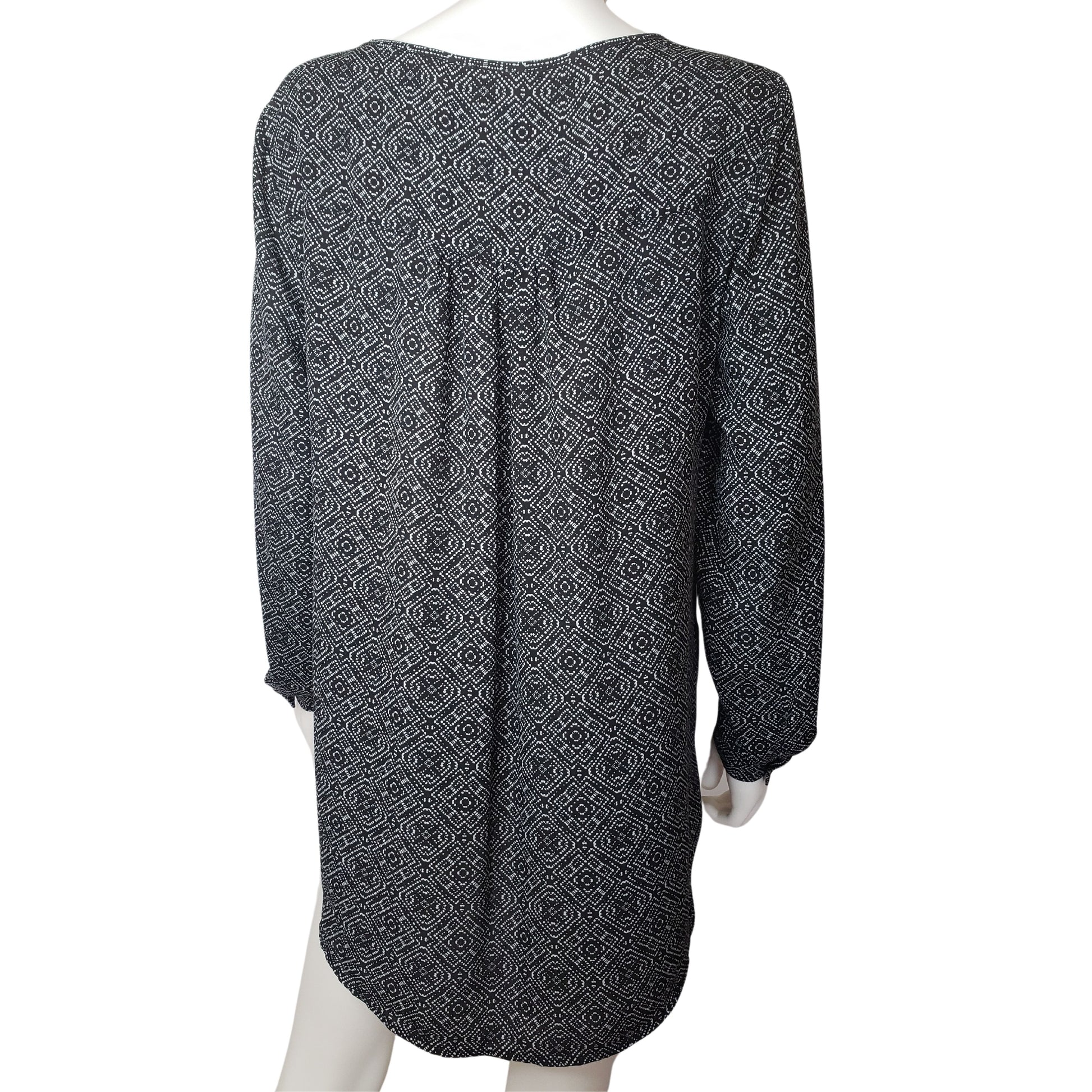 Beautiful black long sleeve shirt with lovely gray pattern, buttoned sleeves, and tulip hem. It's longer in the back for the extra coverage you're looking for!