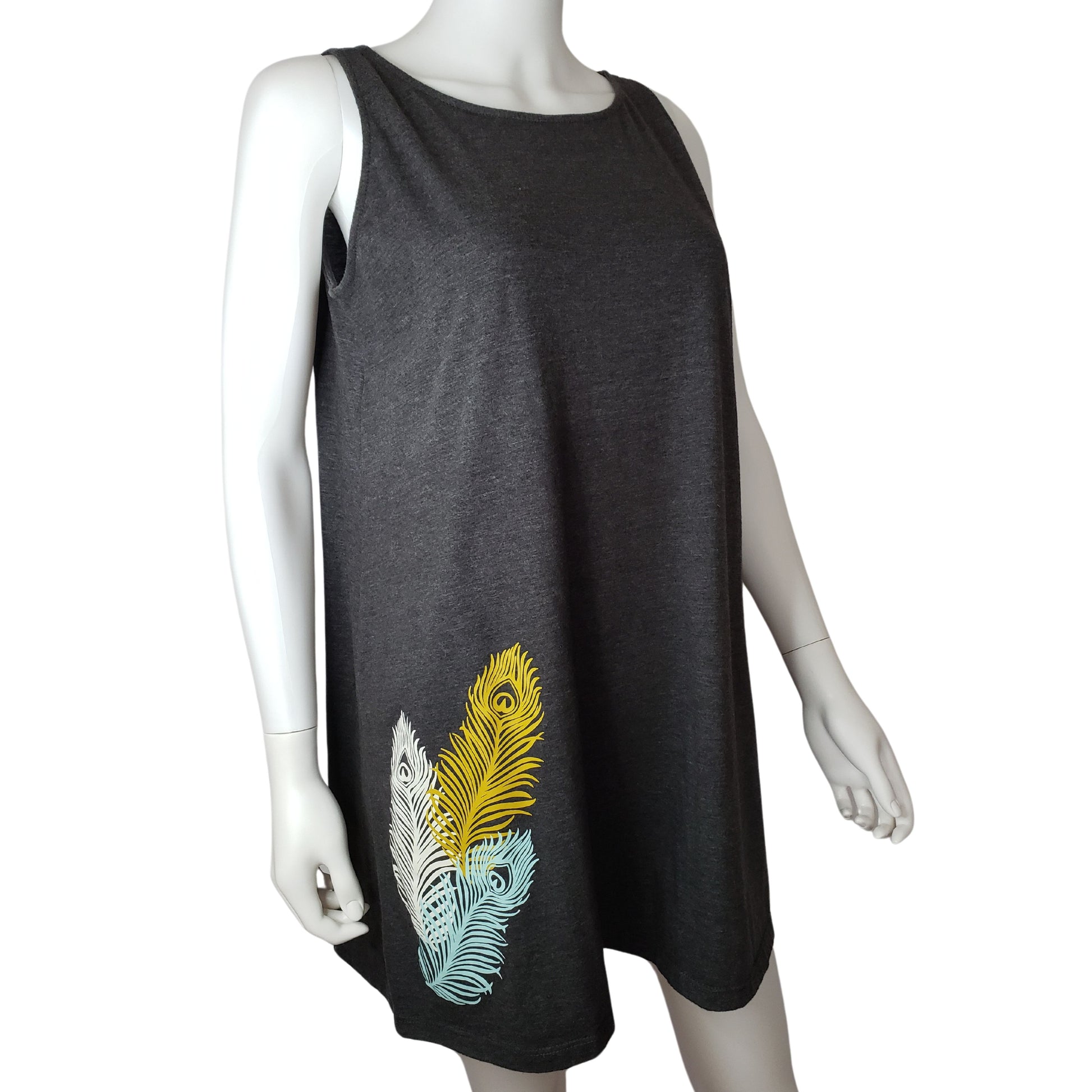 Super soft, comfortable long tank top perfect for casual wear or as swimsuit cover up. Cute feather graphics on the bottom right of the garment.