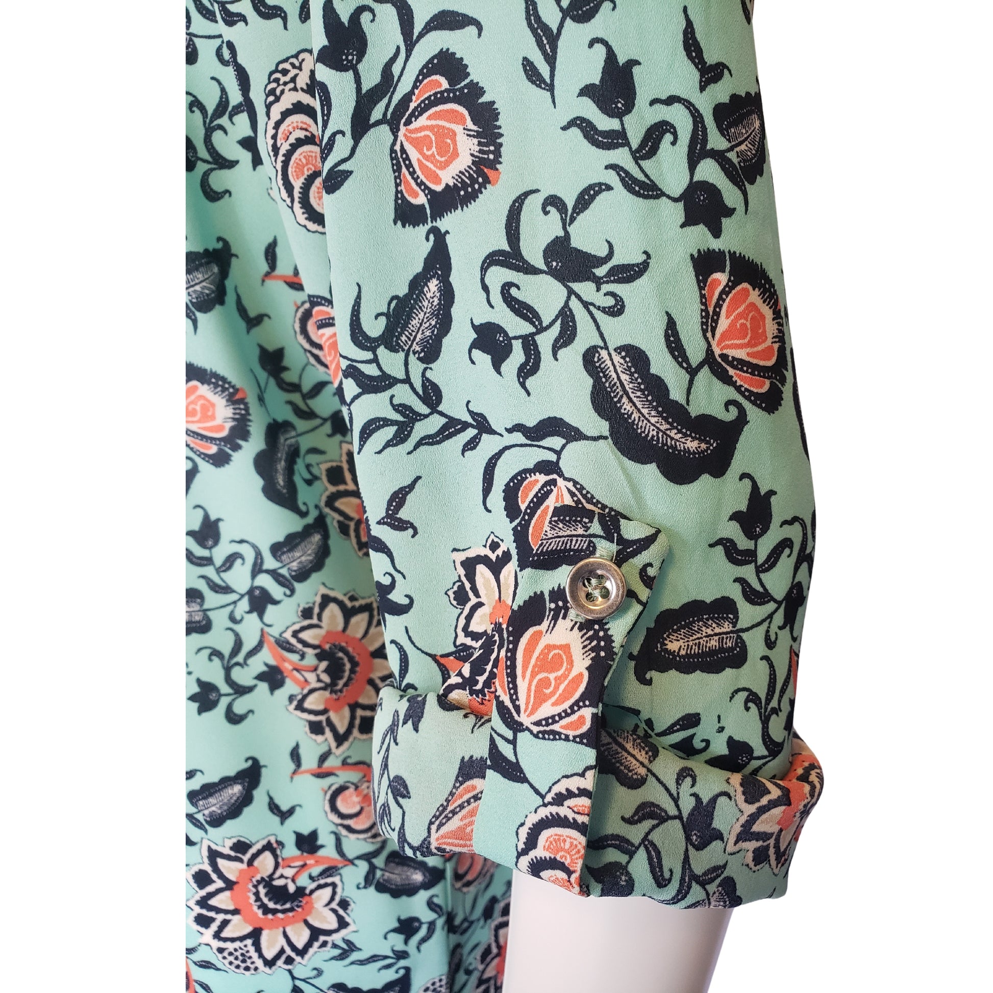 Lightweight mint colored blouse with a floral print and front tie closure. Sleeves can be loosely rolled and buttoned up.