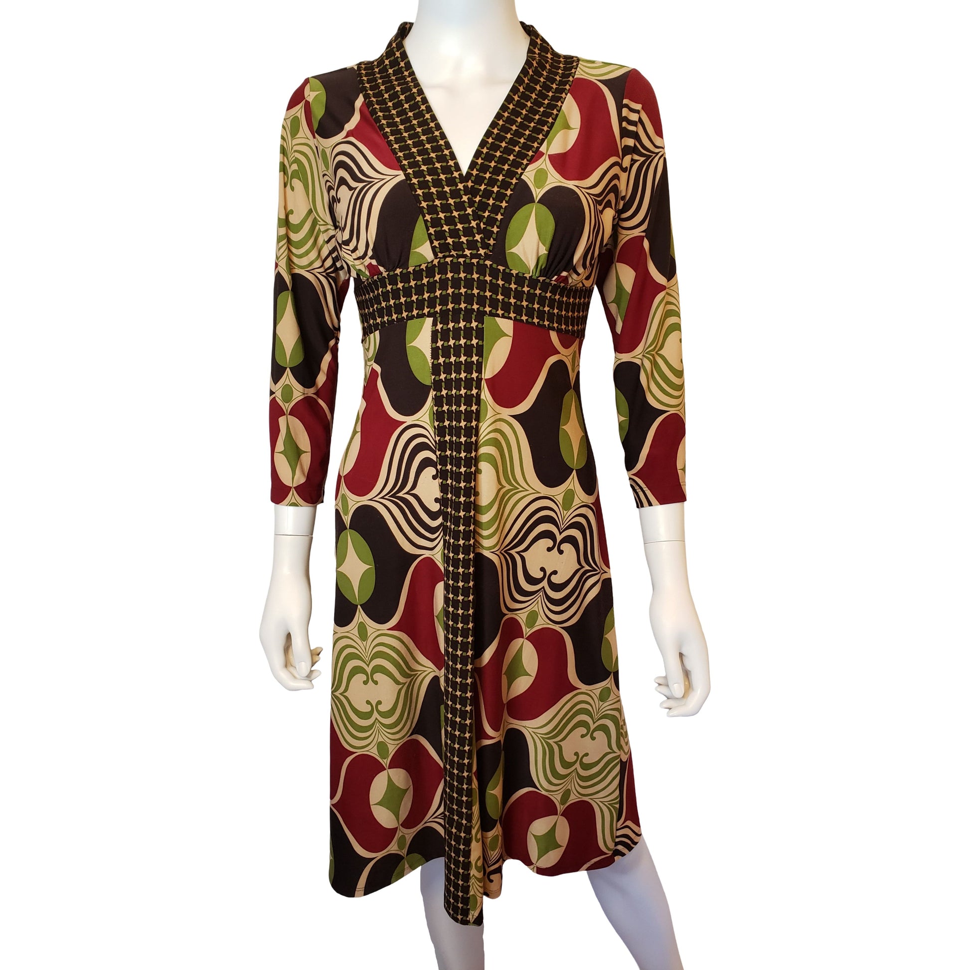 Express your fun, funky side! The 70s inspired pattern and fall colors are sure to draw attention. There is a little bit of pilling around the lower torso area of the dress.