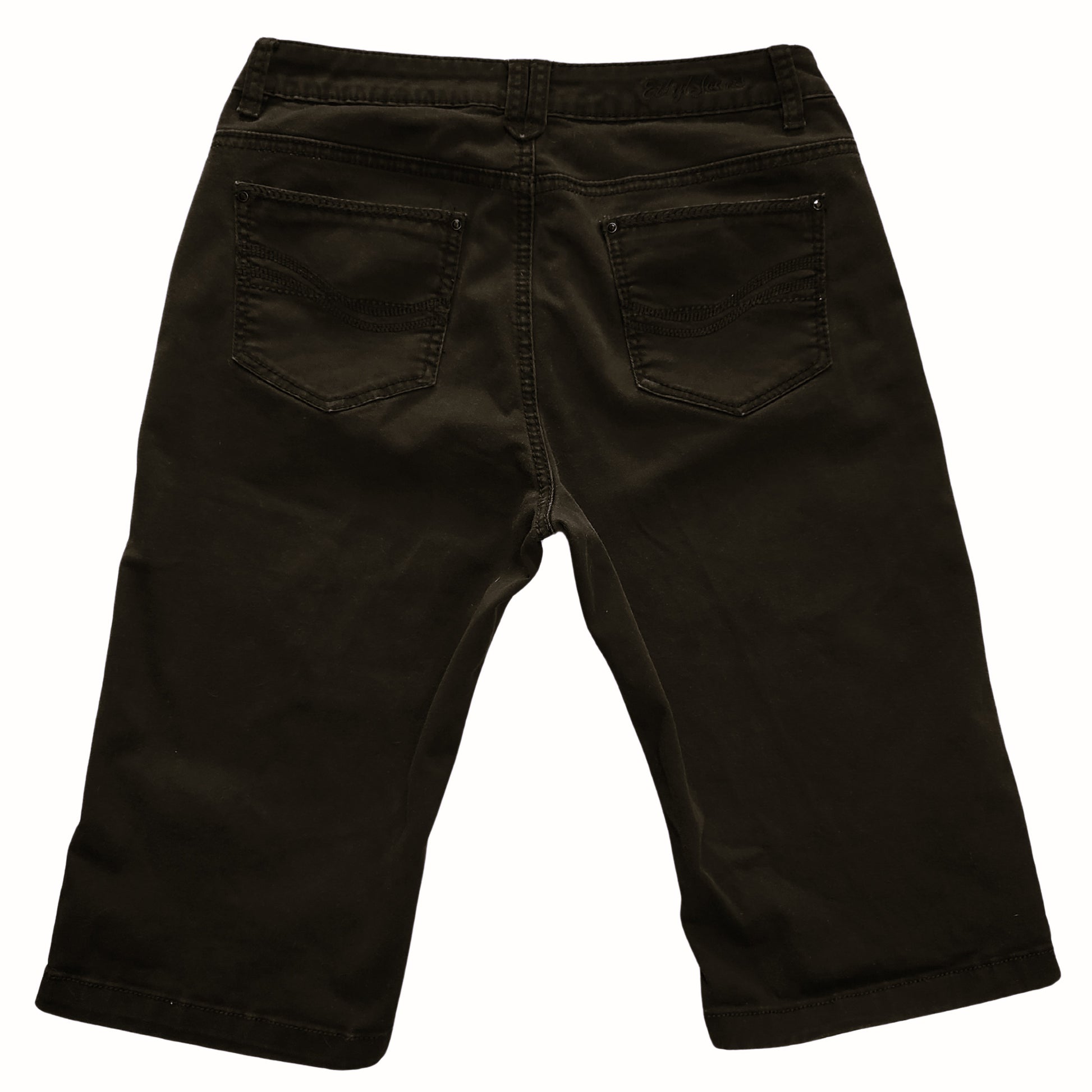 Soft, comfortable black capri pants with faux black onyx buttons and rivets, 2 front pockets with diagonal openings, and 2 traditional rear pockets. Buttoned waistband and zippered fly.
