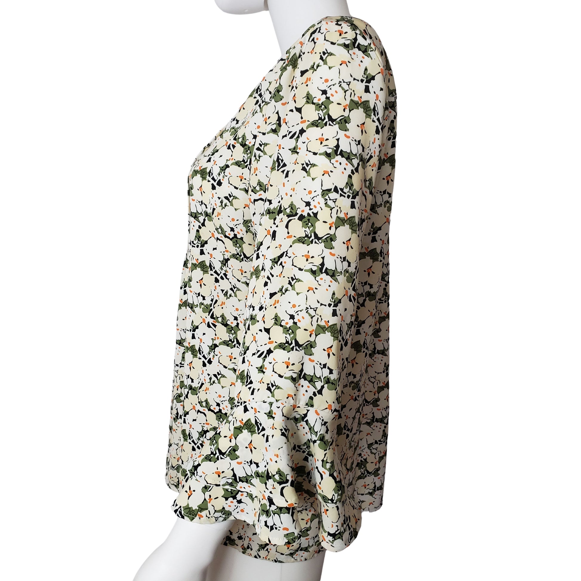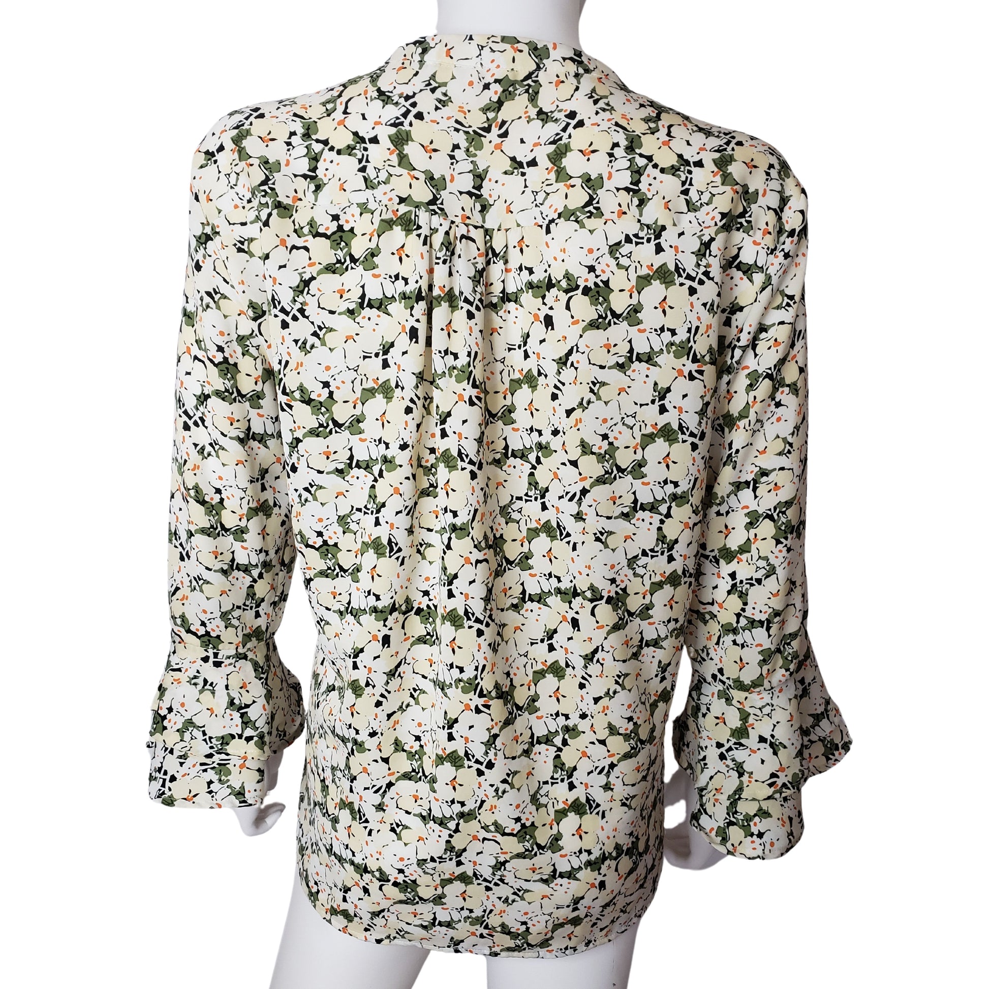 Darling flounced sleeved shirt with light beige flower pattern and green, orange, and black accents. Pleated bust and V neck.