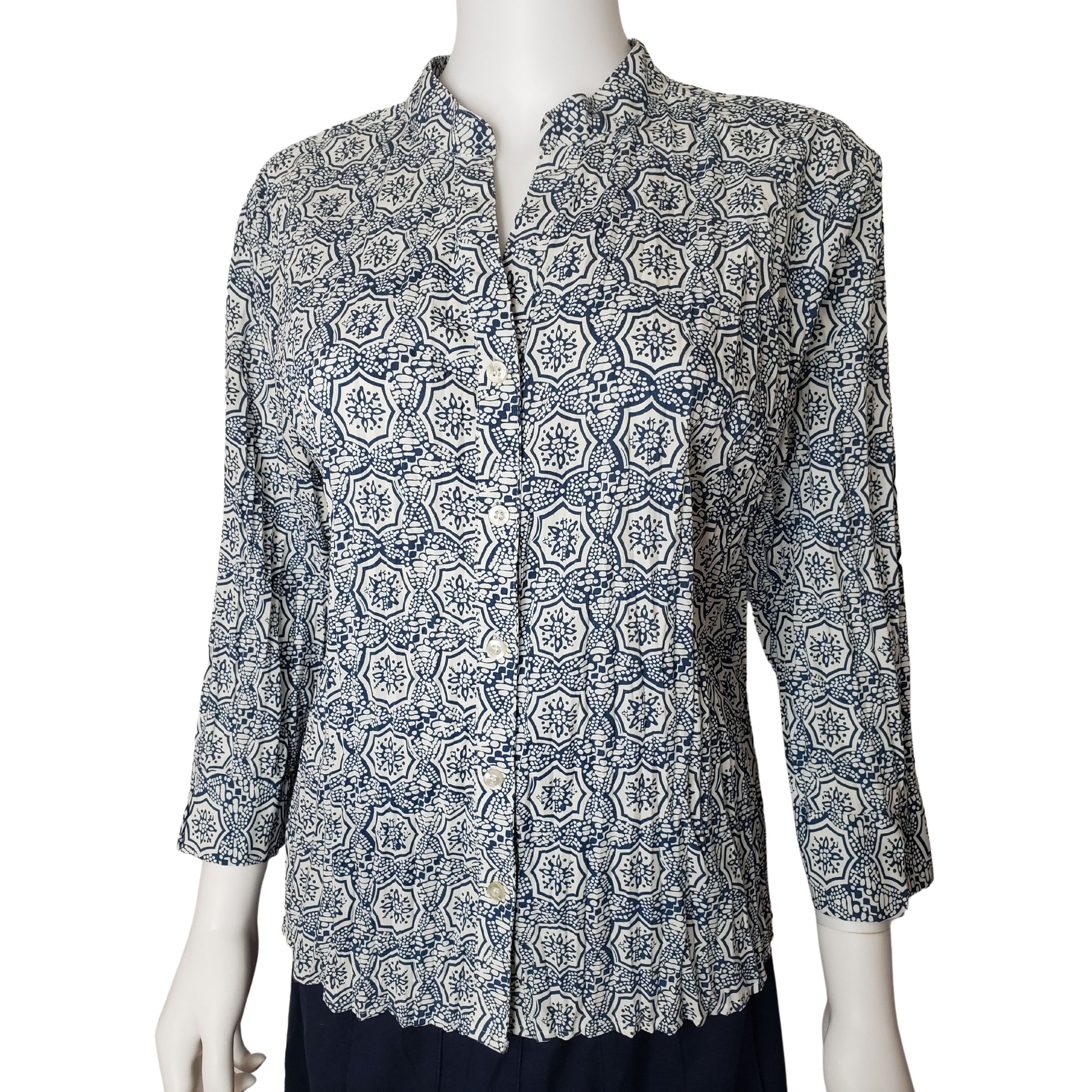 Lovely button up shirt with mandarin collar and charming blue pattern on accordion-style material. Nice enough for work, casual enough for an afternoon outing with friends.