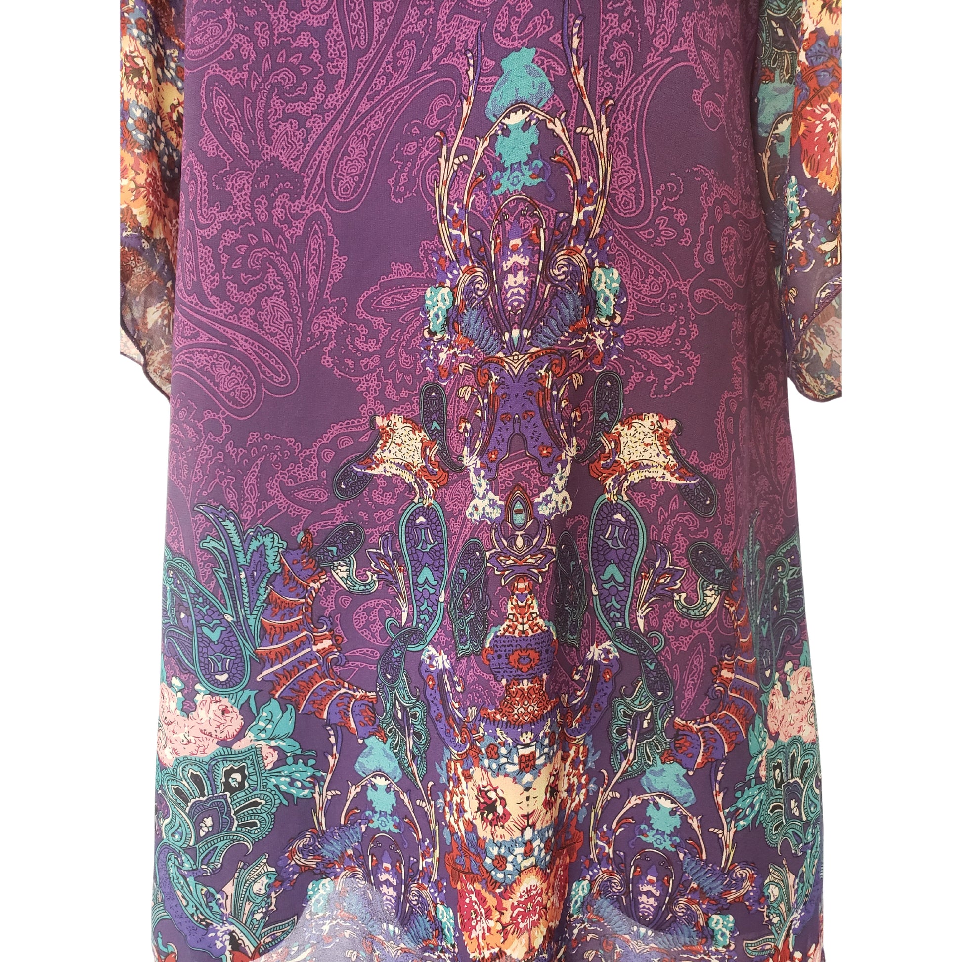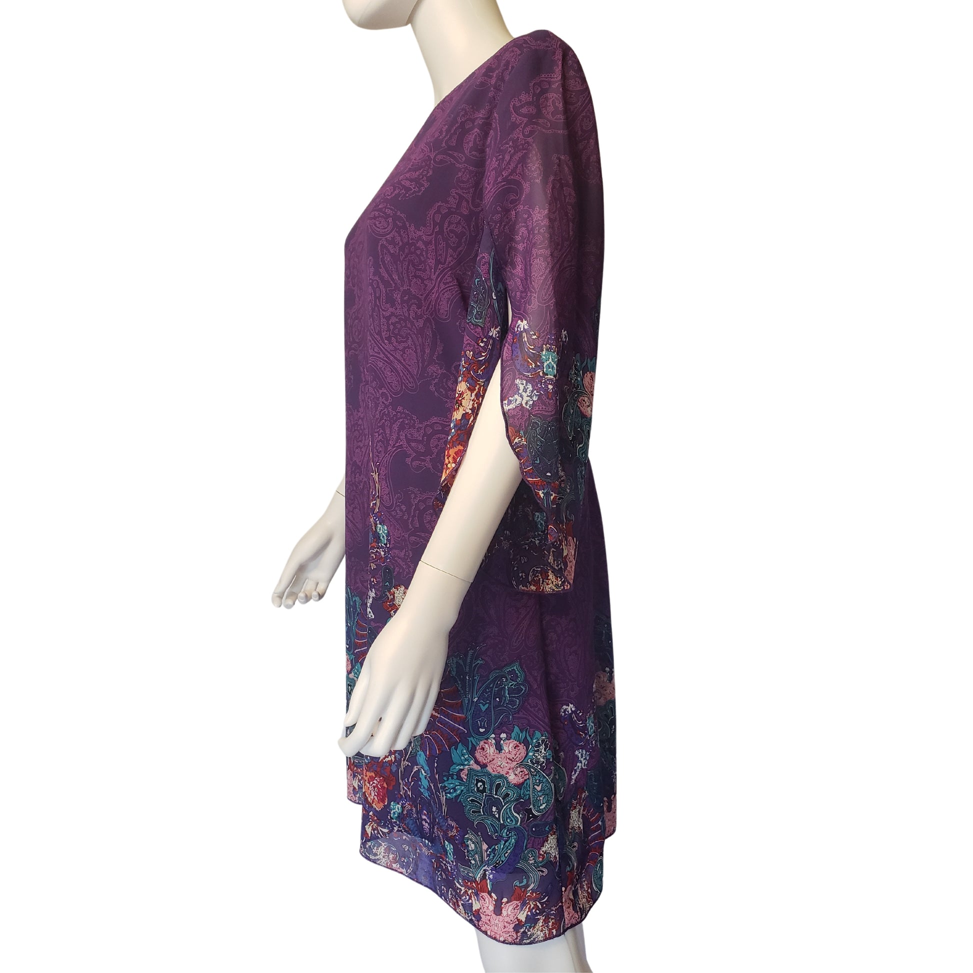 New with tags. Never been worn. Gorgeous purple dress with beautiful paisley designs and flowing petal cape sleeves. The dress is fully lined with a zipper on the back.