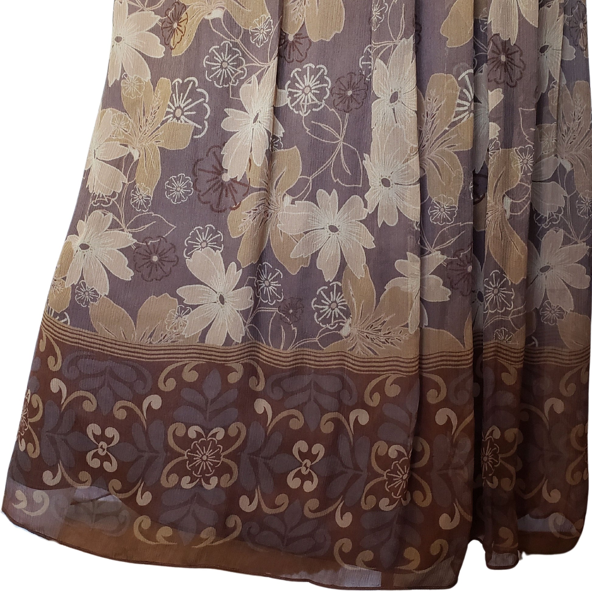 Stunning 100% silk ankle length dress with lovely flowers in shades of tan and brown. Ties around neck and lower back ties can be tied separately (as shown in picture) or tied in criss-cross fashion with the neck ties. Minimally padded bra, zipper on left side.