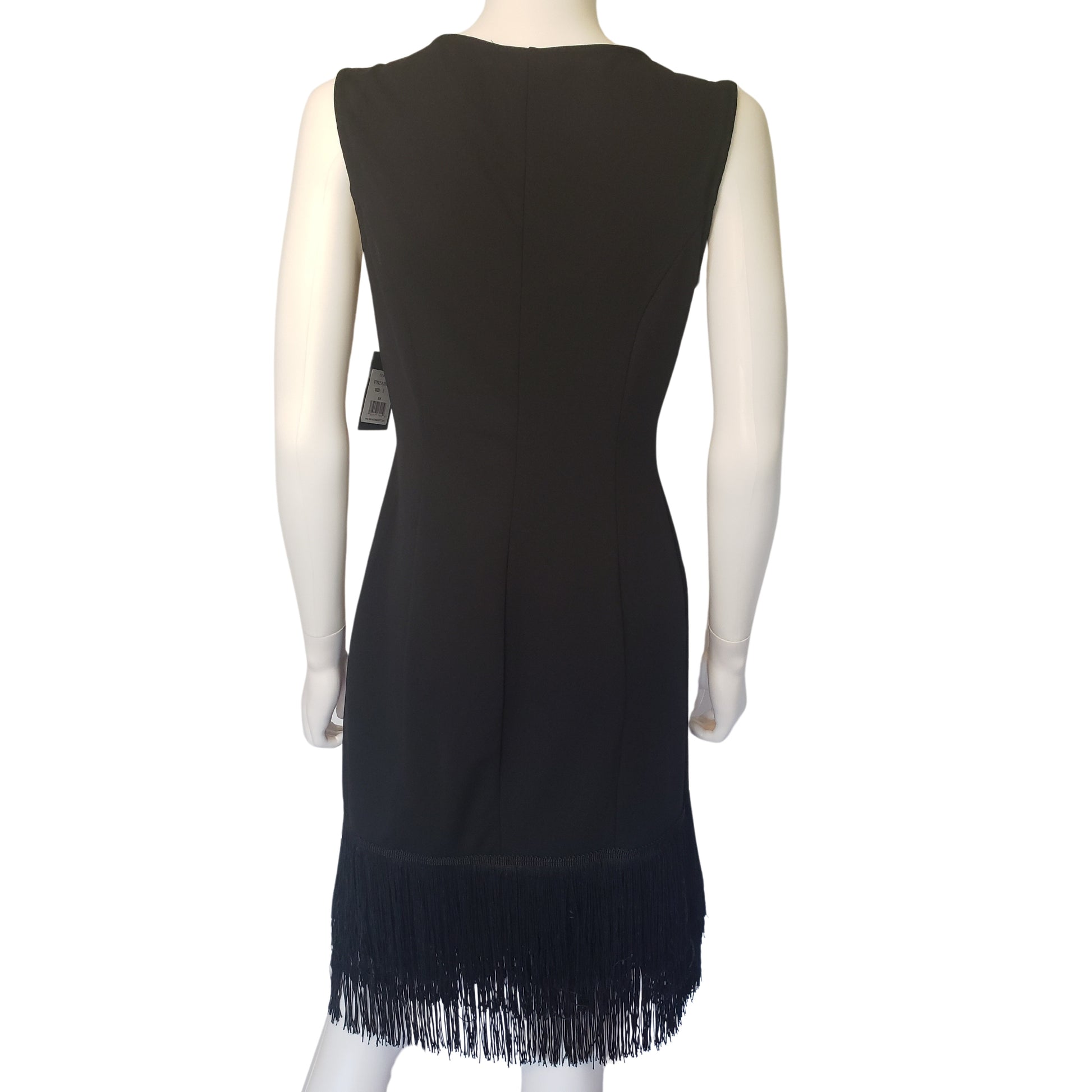 New with tags. Never been worn. Simple black dress with V neck and 3 layers of flapper fringe on the hem. There are no zippers or button for easy on and off.
