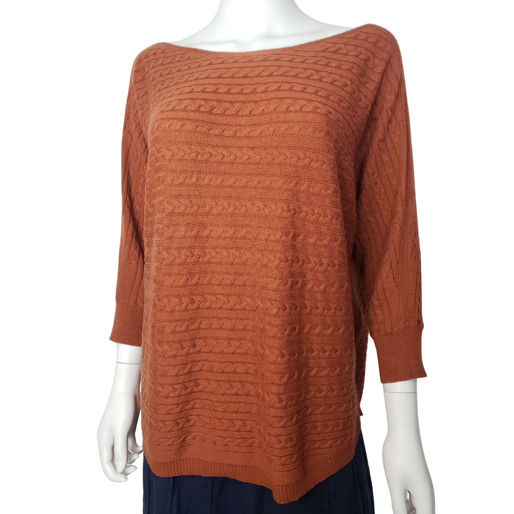 New with tags. Never been worn. Trendy cable knit sweater in a fall-inspired rust orange with 3/4 sleeves. It's lightweight, super soft, and comfortable so can be used throughout several seasons.