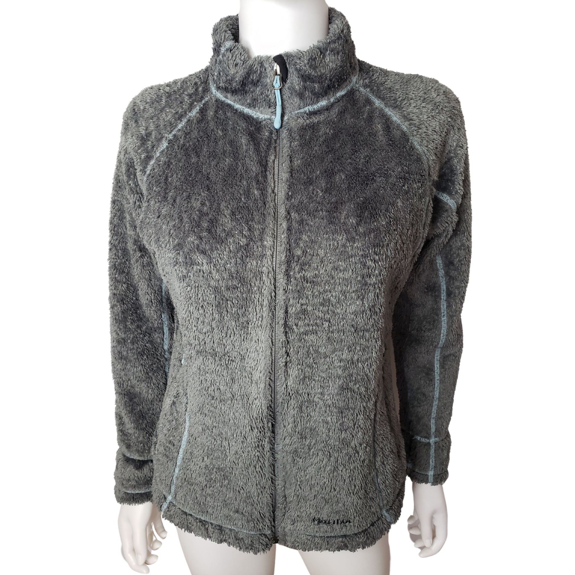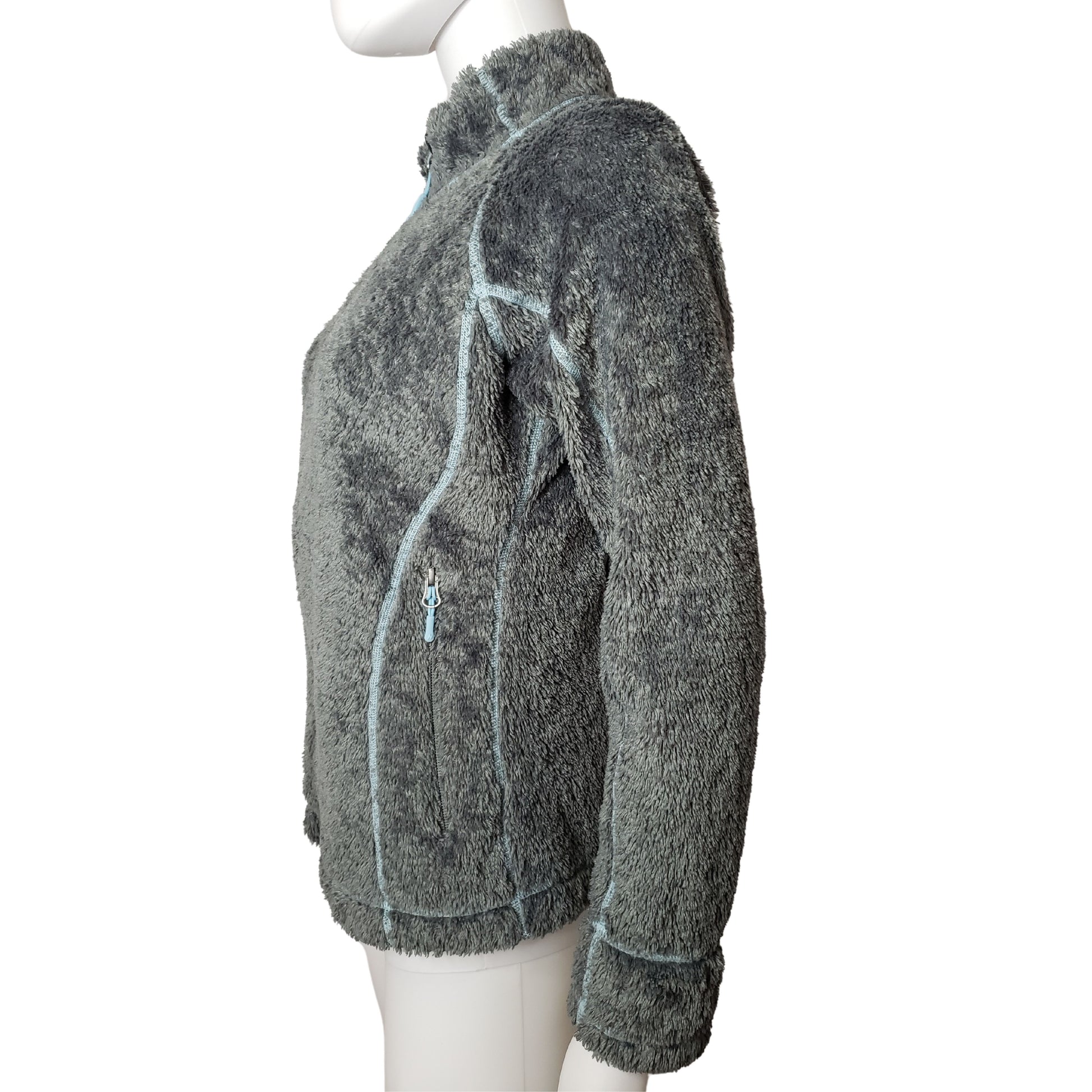 Everyone will want to cuddle you when you're wearing this super fuzzy, super soft zip up jacket! It's gray with light blue stitching, has a full zipper front, 2 zipper side pockets, and thumb holes. It's lightweight but don't let that fool you... it's made of Marmot's PolarTec material so it'll keep you warm in cooler weather.