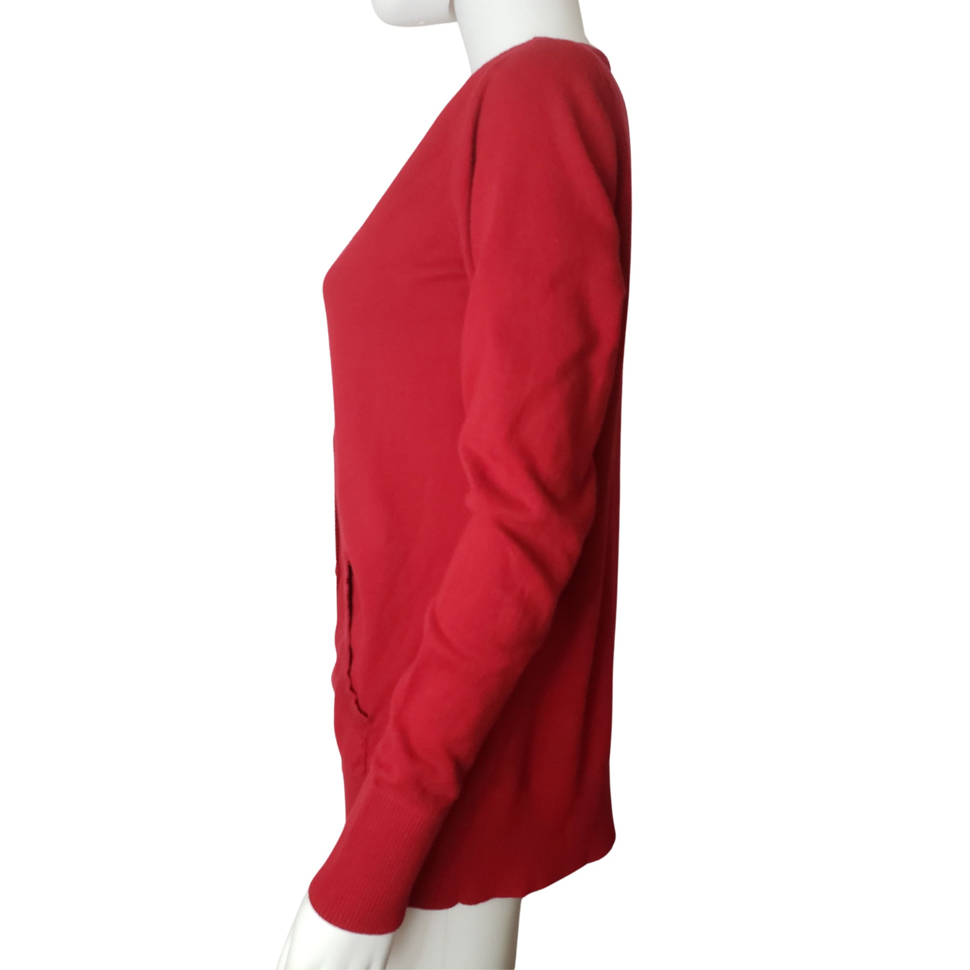 Soft and comfortable red varsity-style sweater cardigan with a little bit of length for that coverage you want. 2 front pockets and large turtle shell-like buttons. Great for your main outfit or for a quick and easy cover up!