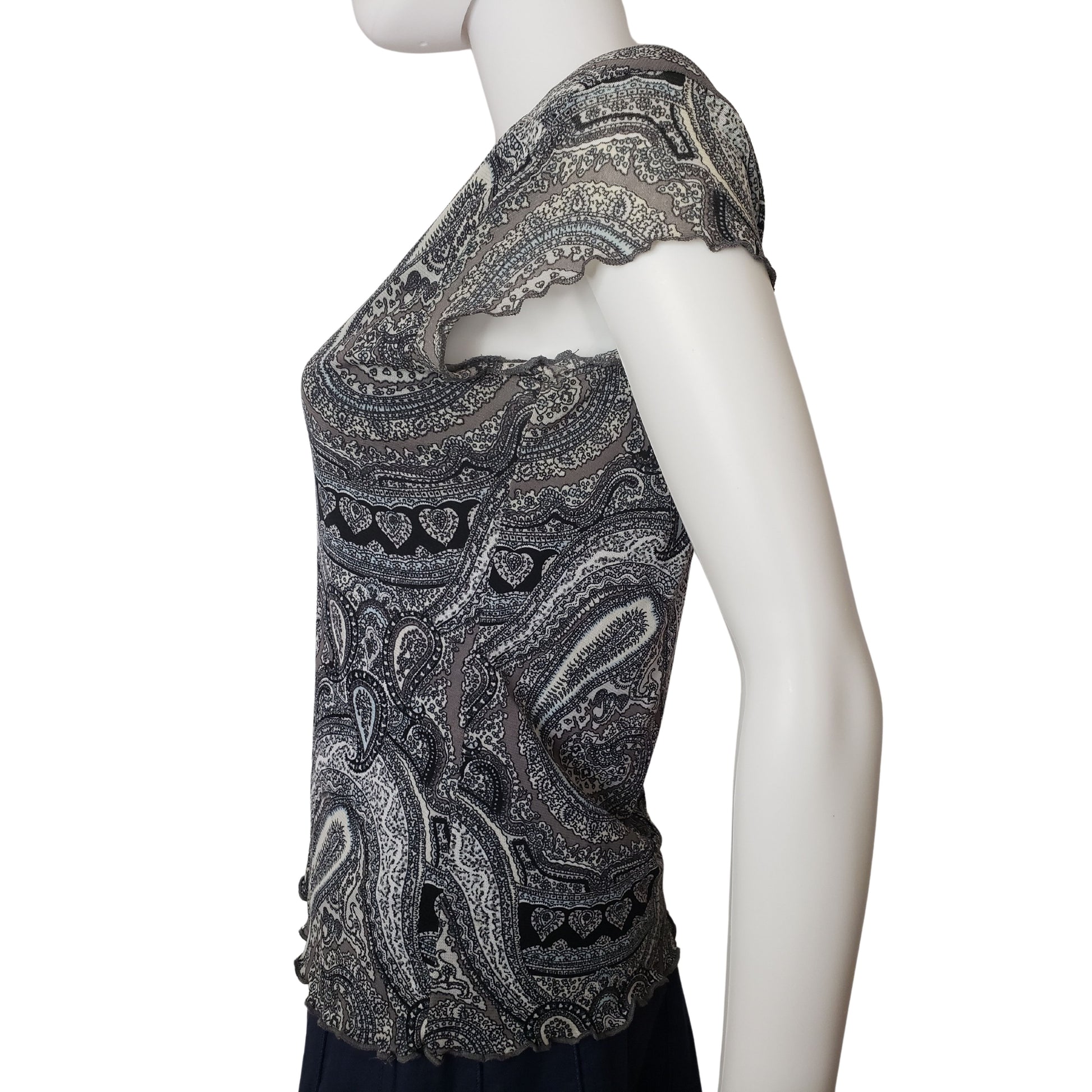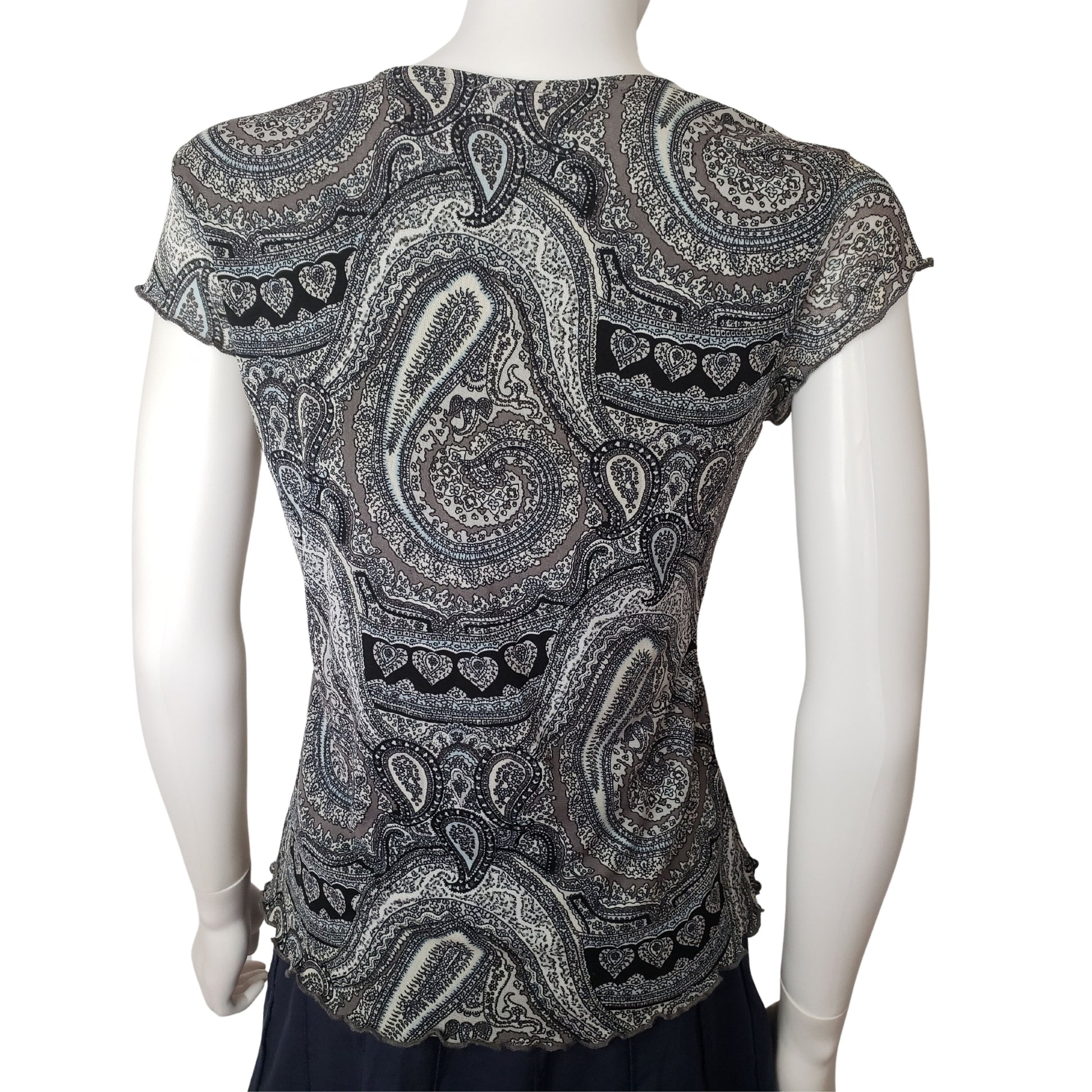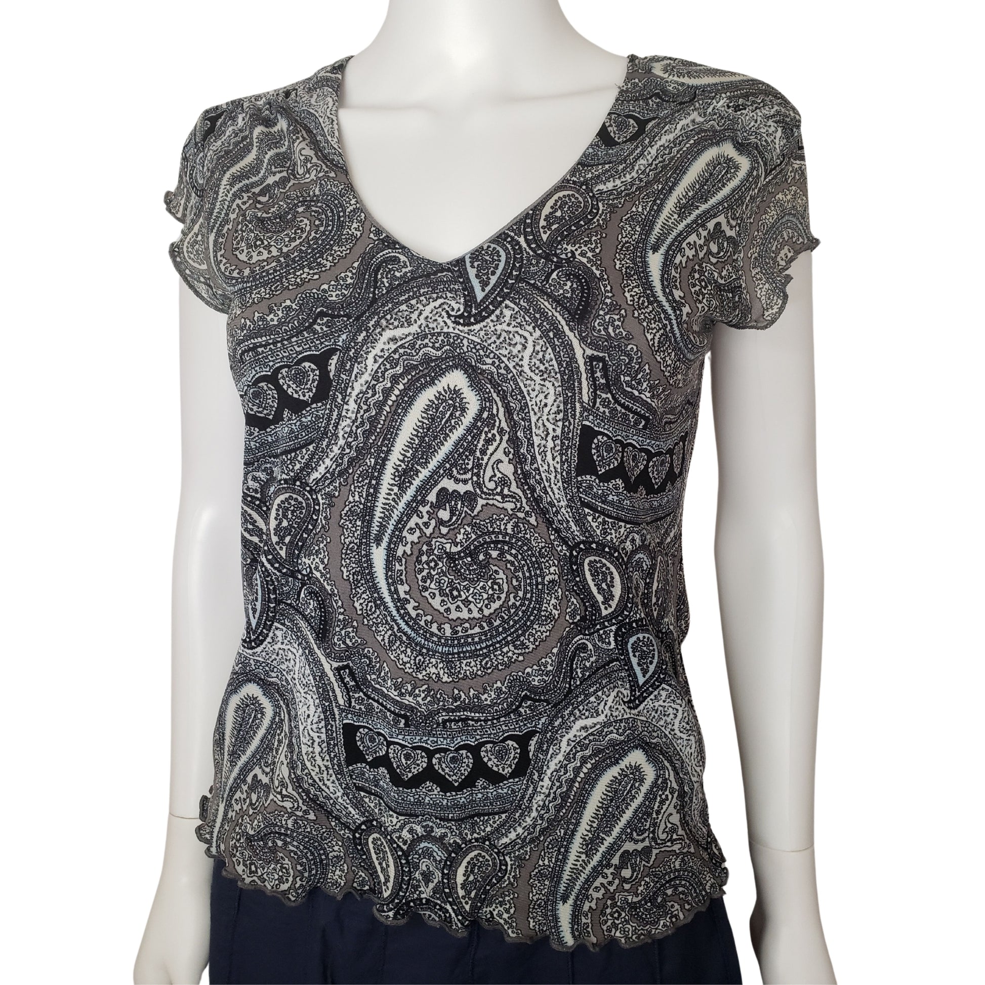 Pretty paisley half sleeve shirt with V neck, built-in gray camisole, and lightly ruffled edges. This is a versatile piece to be used for work or play!