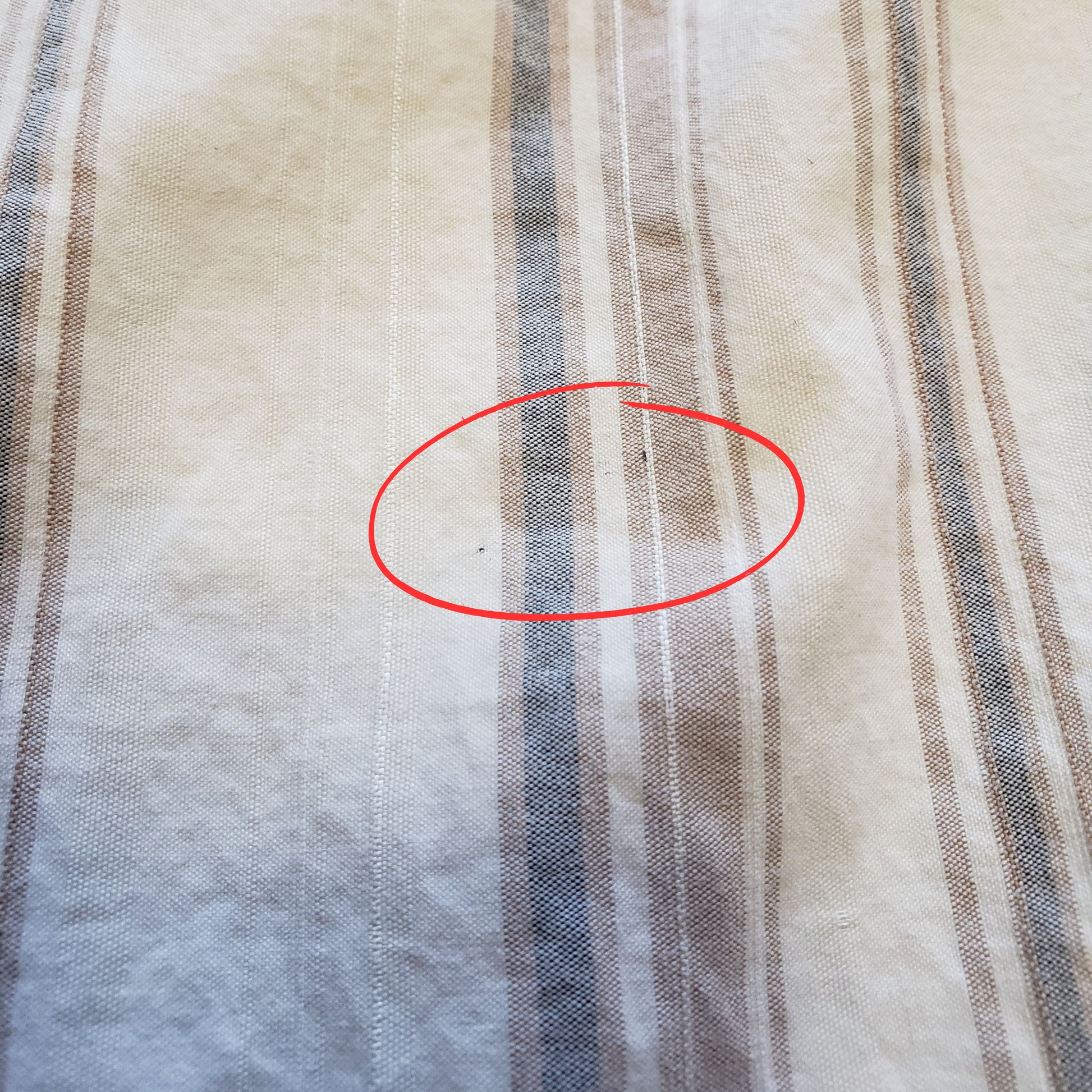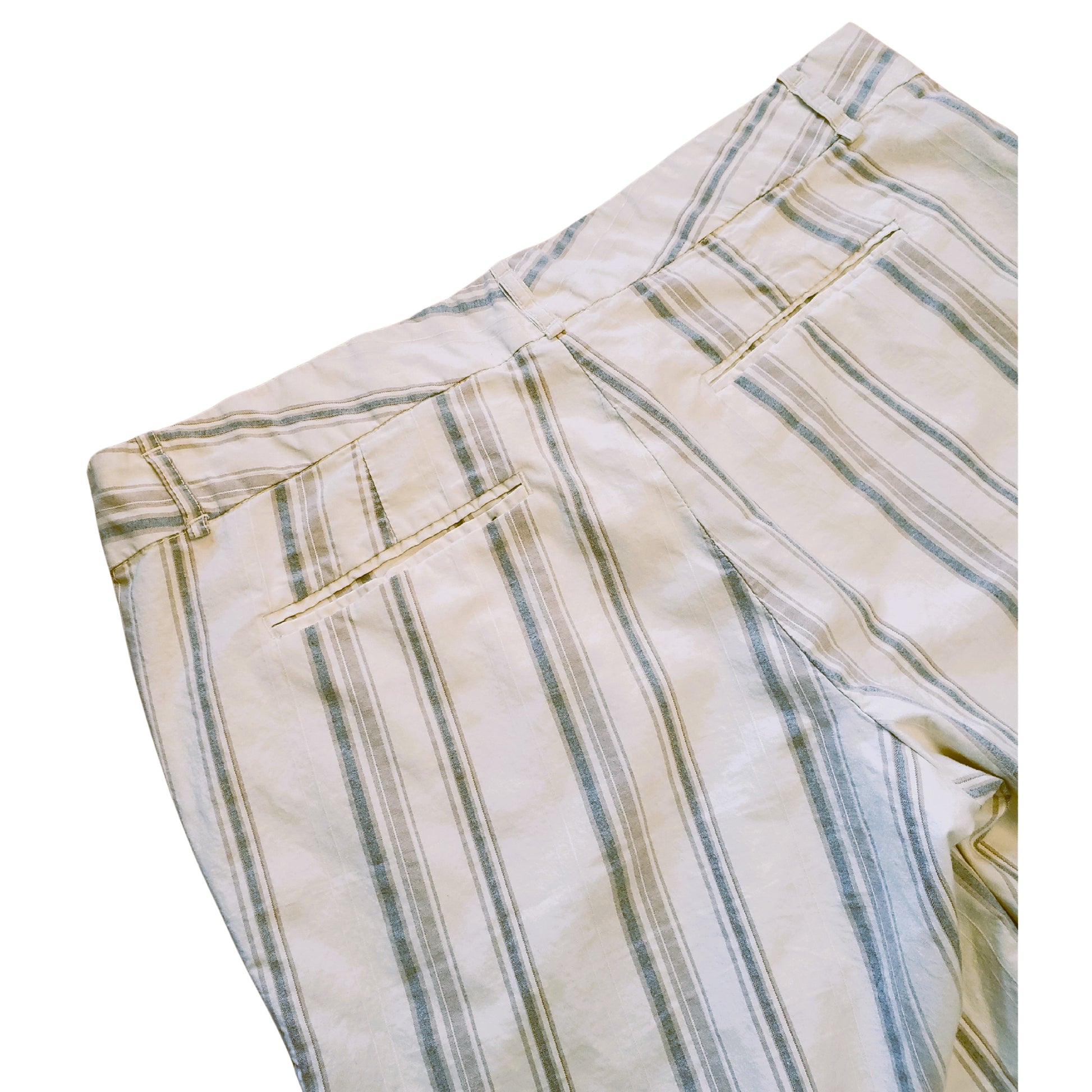 Smart casual shorts with lightly colored stripes, a sewn cuffed hem, 2 diagonal front pockets, and 2 rear slit pockets. Eye hook closures at waistband and zippered fly. There are 2 extremely small, barely noticeable, black dots on back right leg (see pictures).