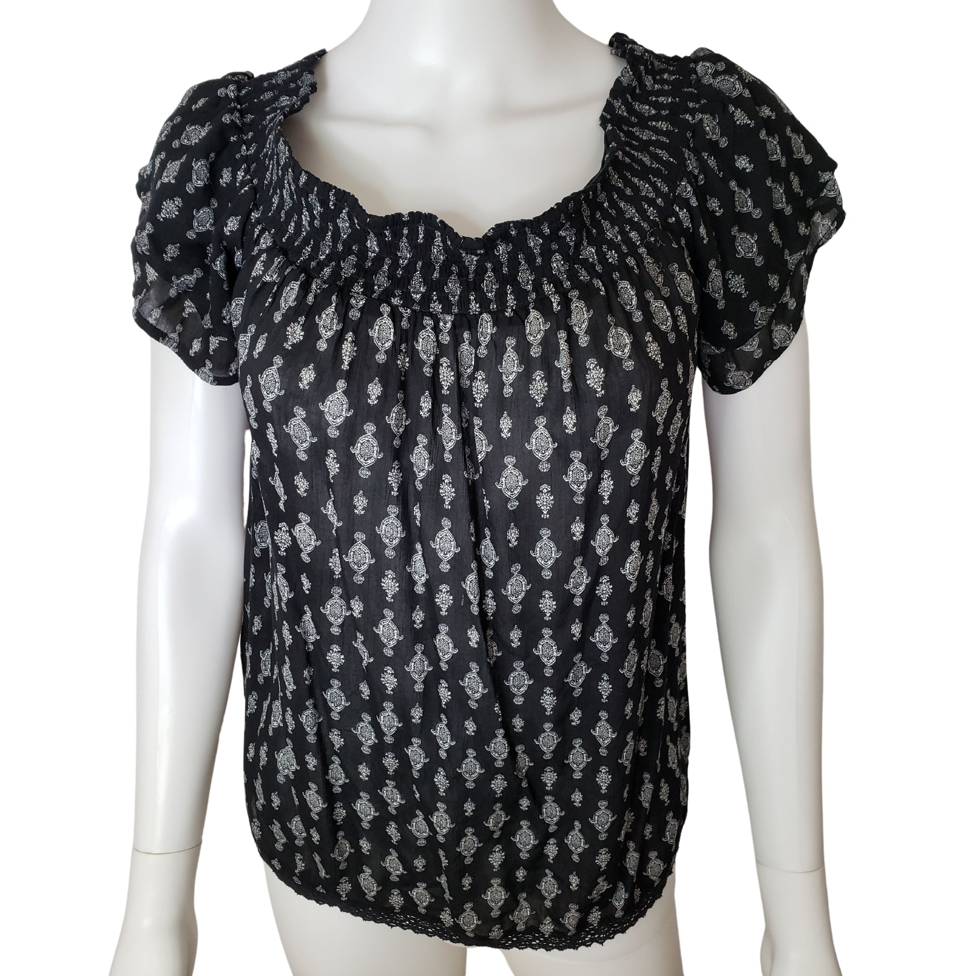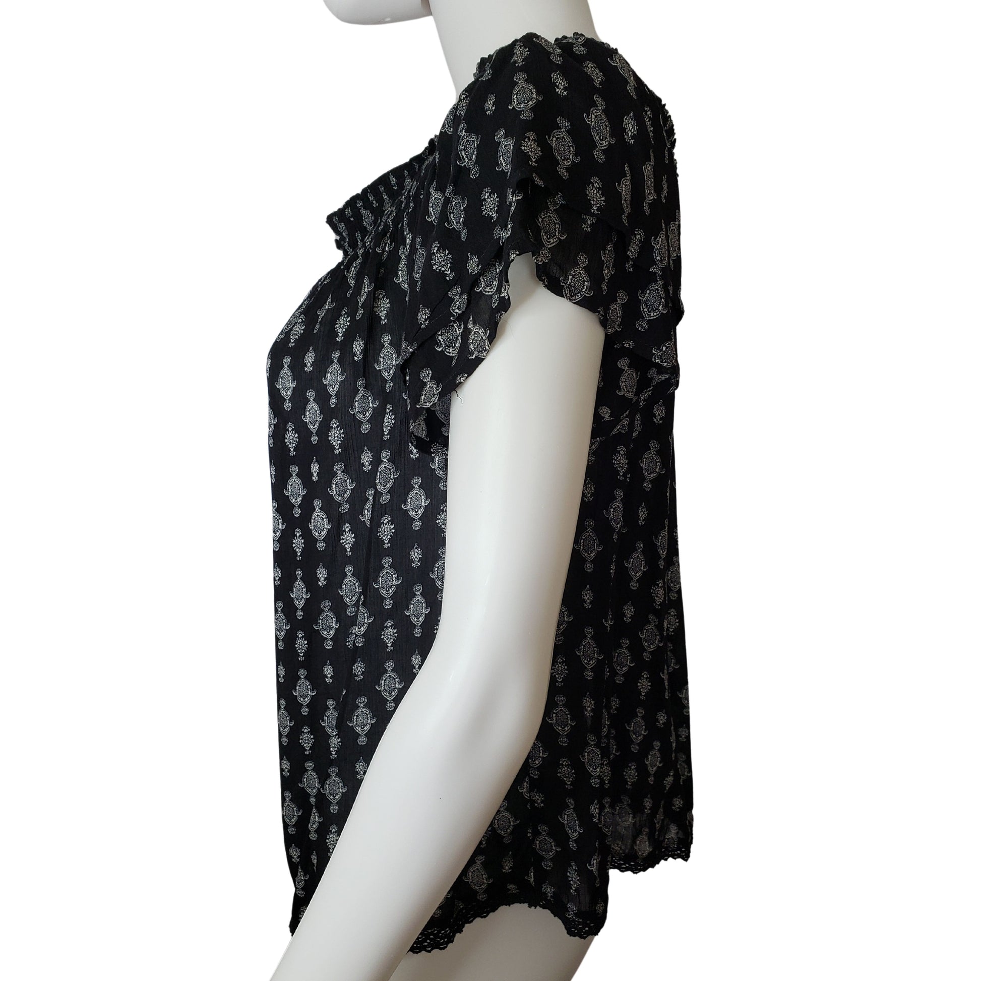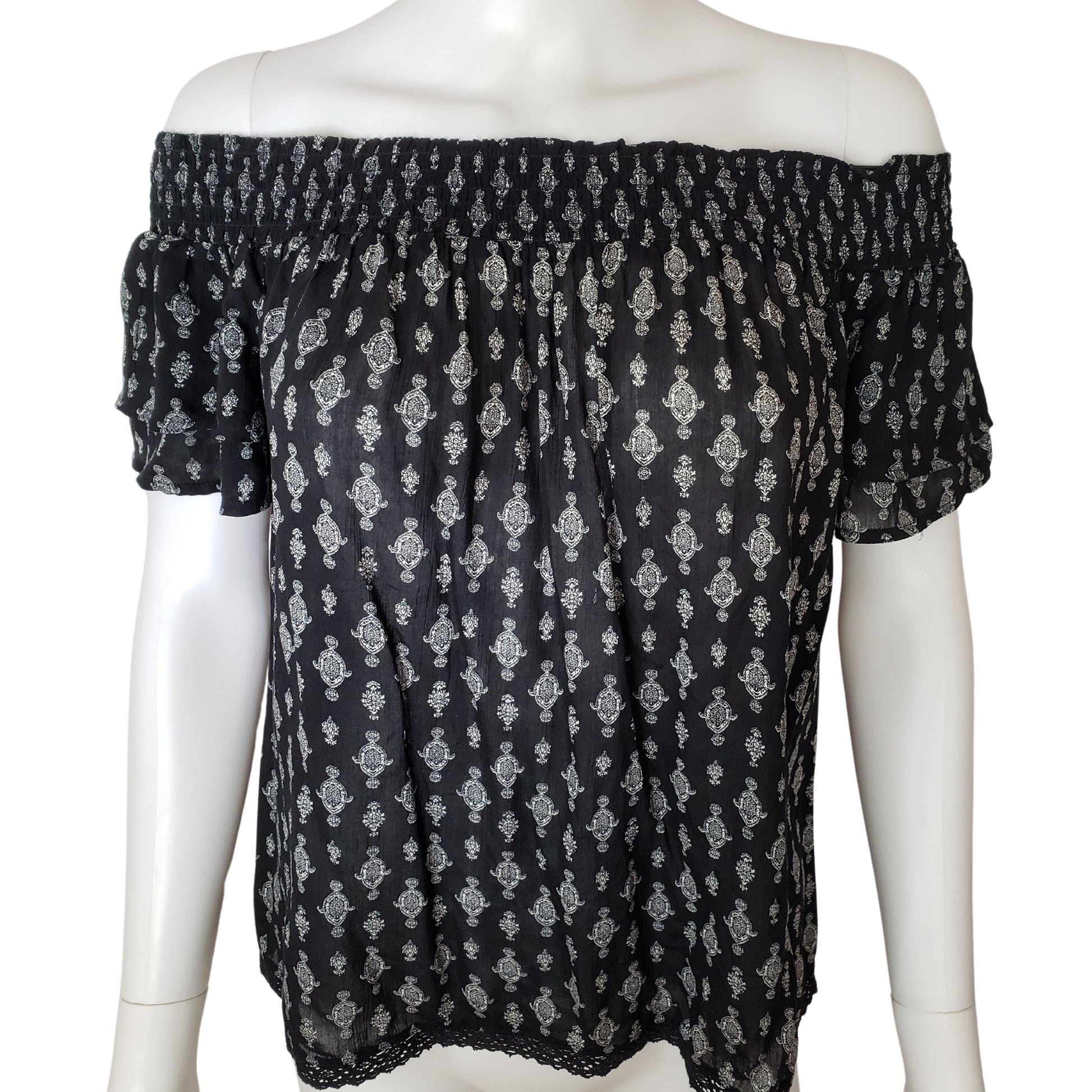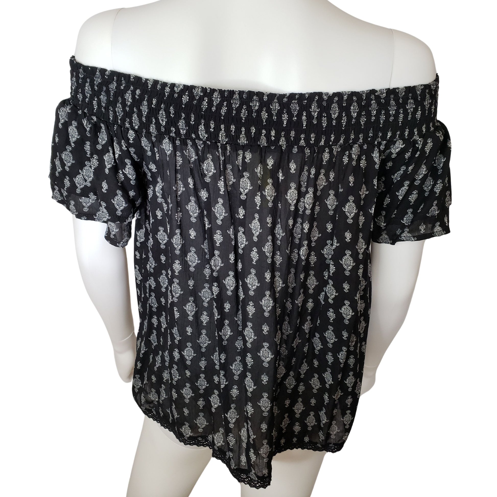 XHILIRATION On or Off Shoulder Black Shirt with White Jewel Pattern and Double Petal Sleeves, Small